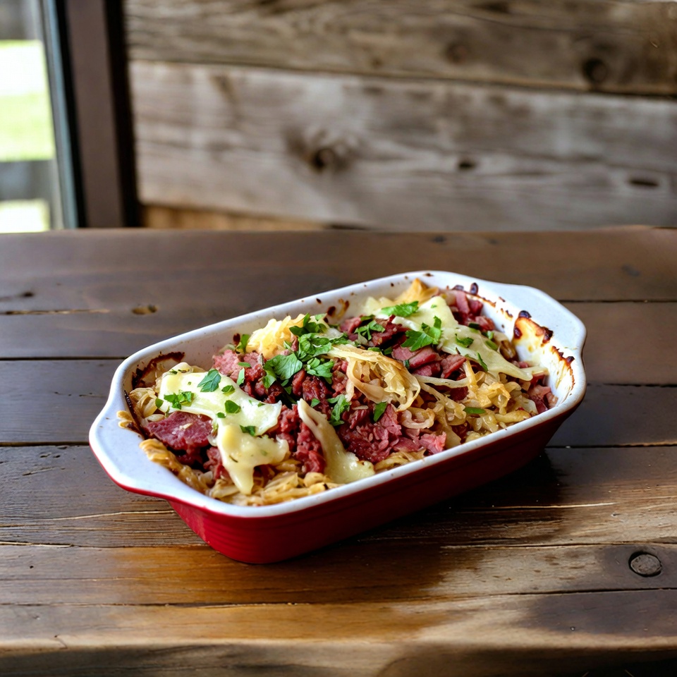 Reuben Bake with Layers of Corned Beef, Sauerkraut, and Swiss Cheese