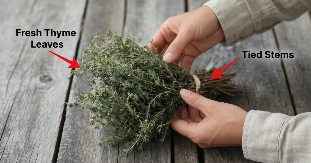 - Add the dried thyme and simmer gently, then remove from heat.