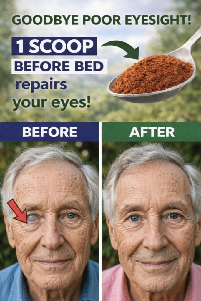 A widely shared image shows a reddish-brown powder, advertised as a single scoop taken before sleep, paired with dramatic before-and-after eye photos: cloudy, cataract-like eyes turning crystal clear overnight. Despite the compelling visuals, this is classic clickbait marketing an unproven remedy, not a medically validated treatment.